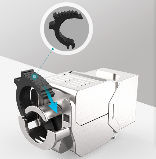 就目前國(guó)內(nèi)的綜合布線產(chǎn)品的網(wǎng)絡(luò)模塊而言,很少有公司或工廠如此的貼心,為了能夠使用方便,固定住線扣,方便取下線纜,而自主研發(fā)了新型專利扎線扣款式,此扎線扣可以便捷扎線,能夠牢固線纜不脫落。此扎線扣專利號(hào)為201930290862.9。